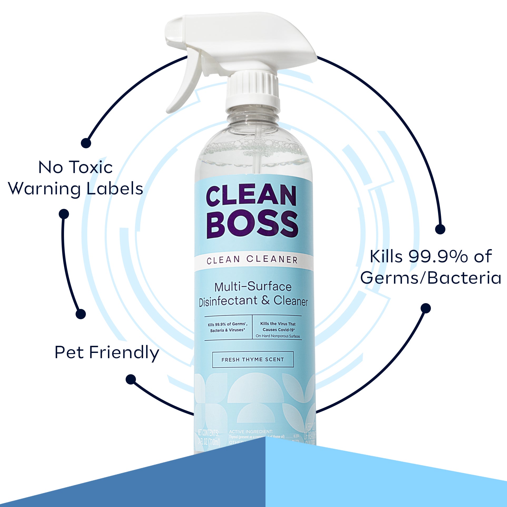 Our award winning CleanBoss Multi-Surface Botanical Disinfectant kills 99.9% of germs and is a heavy duty cleaner that cuts grease and grime on virtually every surface in your home, including granite countertops and stainless steel appliances, glass, windows and TV screens, bath tiles, sinks and toilet bowls, wood floors, high chairs, baby toys and more. CleanBoss also cleans and sanitizes soft surfaces such as fabric, carpet, upholstery and dog beds. Save time and space, because CleanBoss replaces over 15 different types of old school chemical household cleaners. CleanBoss truly does it all.