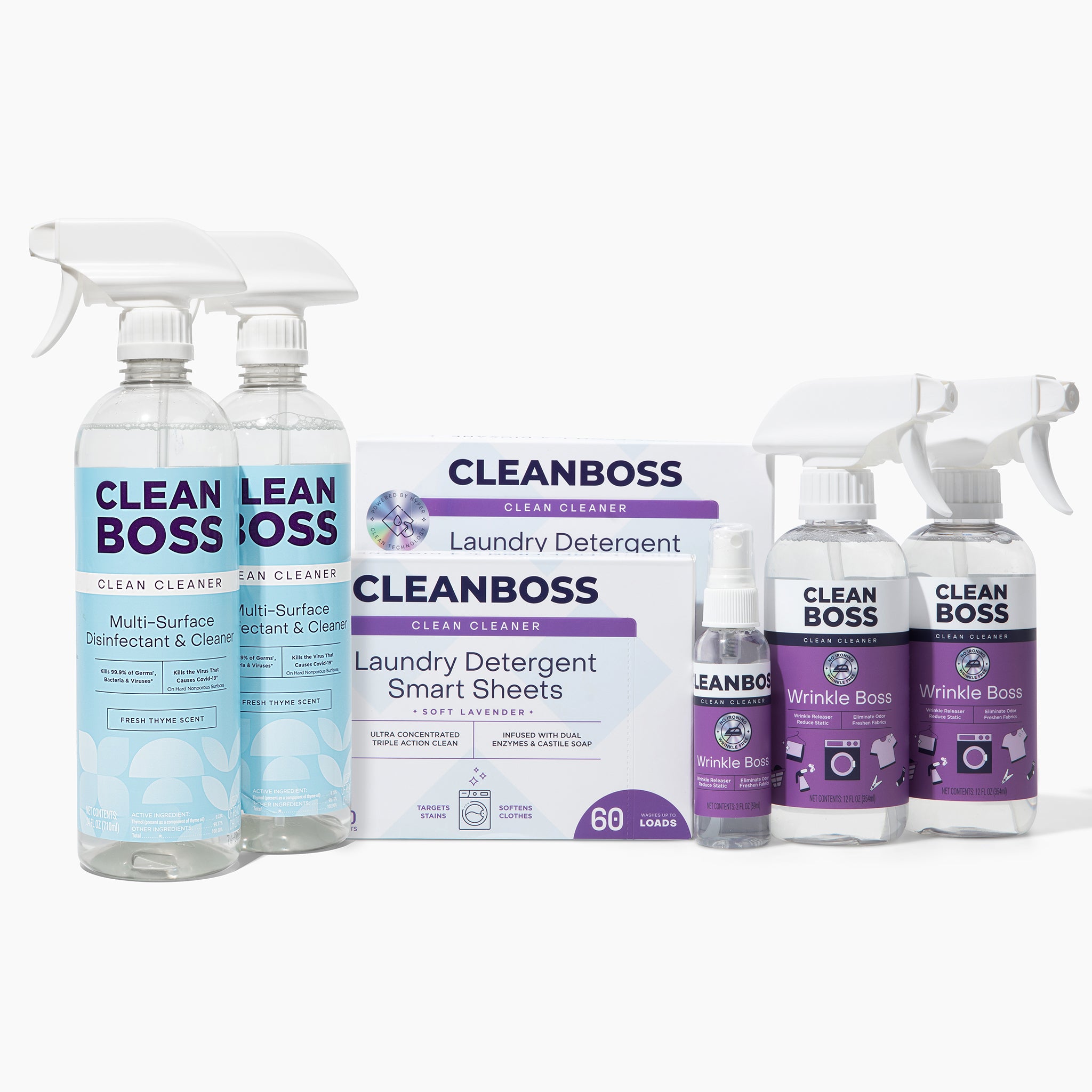 Meet The CleanBoss Triple Threat Bundle — the most powerful clean-from-start-to-finish system for your clothes and home. This 3-step solution is designed to pre-treat and sanitize, deep clean in the wash, and instantly release wrinkles — delivering professional-level results without harsh chemicals, toxic fumes, or unnecessary hassle.